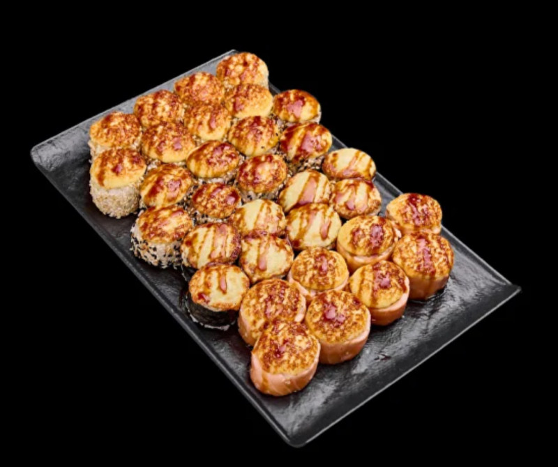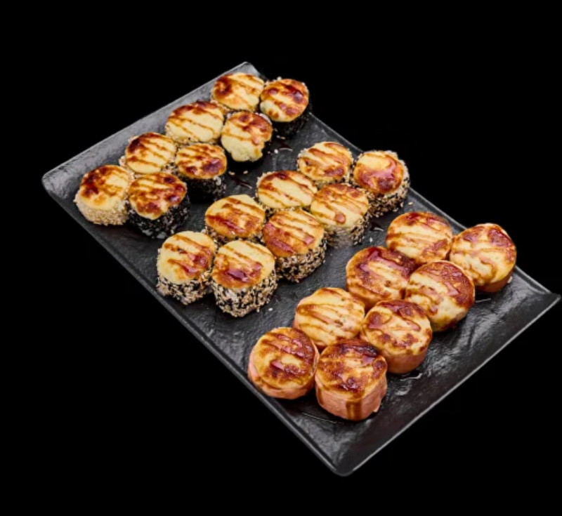 Нори, рис, тигровая креветка, сырная масса для запекания, авокадо, икра массаго, сухари панко, кляр, соус