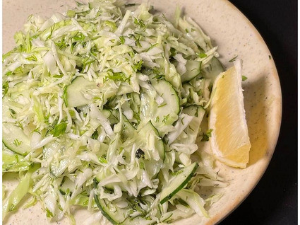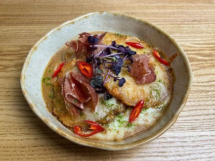 Тако, релиш из квашеного огурца, руккола, перец чили, микрогрин, устричный соус, рваная свинина