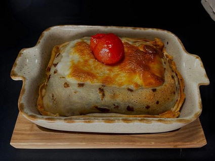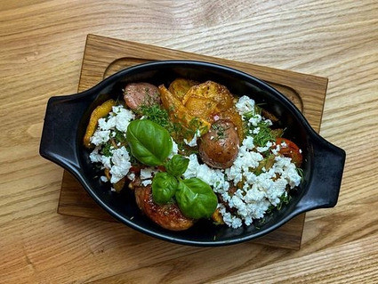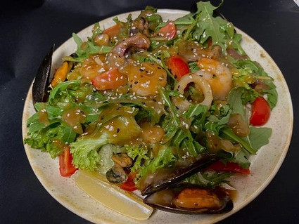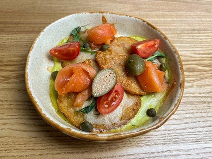 Тако, сырный мусс с вялеными томатами, рукола, устричный соус, помидоры черри, кунжут, креветка тигровая