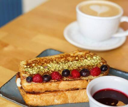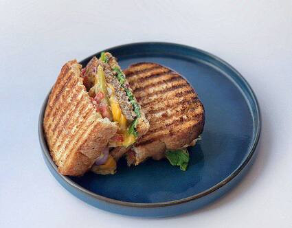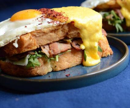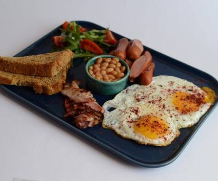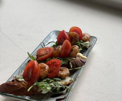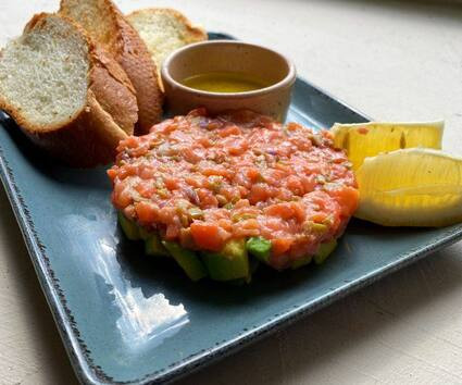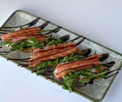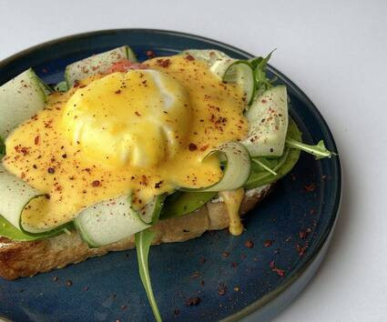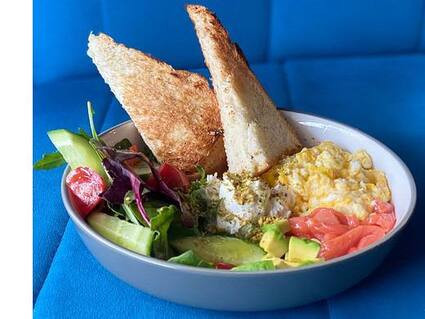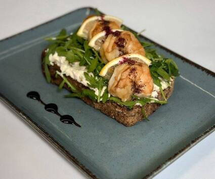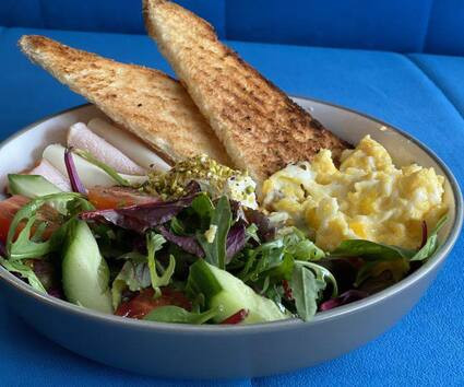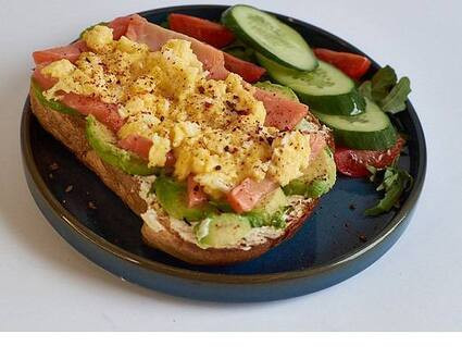 Вершковий скрембл з двох яєць на бріоші/житньому хлібі з тунцем, крем сиром, авокадо та салатиком
