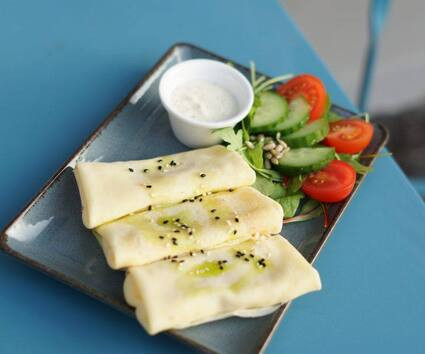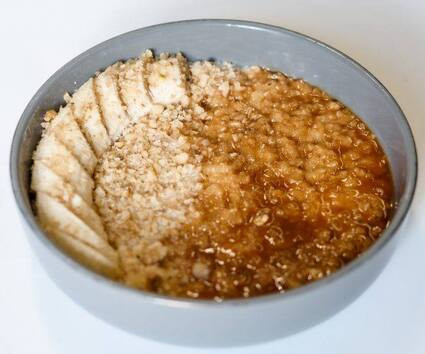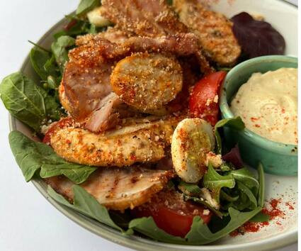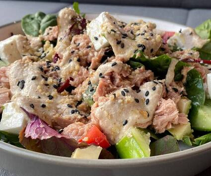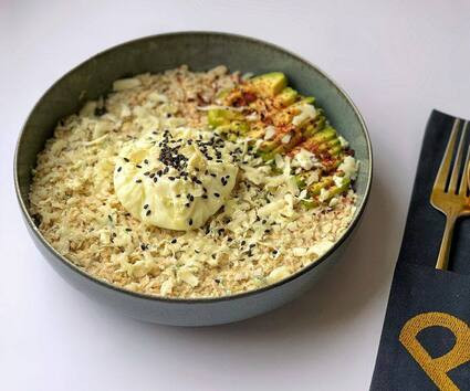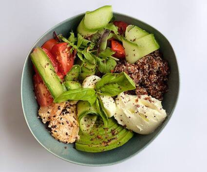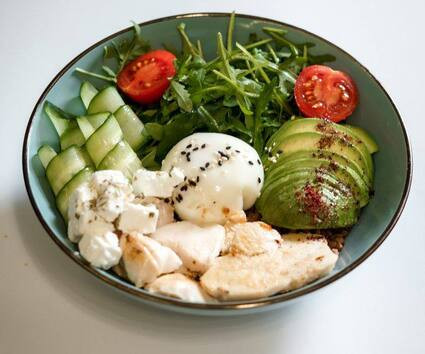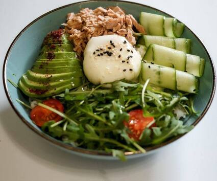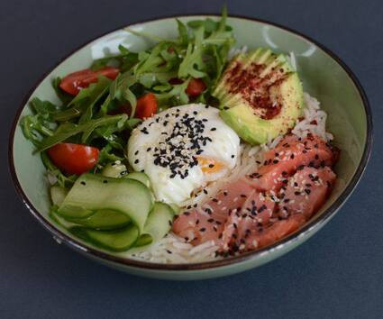 Кіноа, лосось, авокадо, мікс салат з огірочком і чері, перепелине яйце